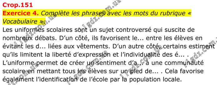 Exercice 4. Complète les phrases avec les mots du rubrique « Vocabulaire ». Les uniformes scolaires sont un sujet controversé qui suscite de nombreux débats. D’un côté, ils favorisent le... entre les élèves en évitant les d... liées aux vêtements. D’un autre côté, certains estiment qu’ils limitent la liberté d’expression et l’individualité des é... . L’uniforme permet de créer un sentiment d’a... à une communauté scolaire en mettant tous les élèves sur un pied de... . Cela favorise également l’identification de l’école par la population locale.