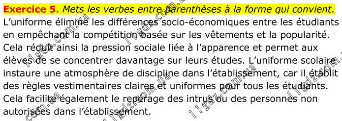 Exercice 5. Mets les verbes entre parenthèses à la forme qui convient. L’uniforme élimine les différences socio-économiques entre les étudiants en empêchant la compétition basée sur les vêtements et la popularité. Cela réduit ainsi la pression sociale liée à l’apparence et permet aux élèves de se concentrer davantage sur leurs études. L’uniforme scolaire instaure une atmosphère de discipline dans l’établissement, car il établit des règles vestimentaires claires et uniformes pour tous les étudiants. Cela facilite également le repérage des intrus ou des personnes non autorisées dans l’établissement.