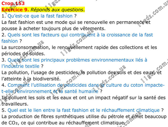 Exercice 9. Réponds aux questions. 1. Qu’est-ce que la fast fashion ? La fast fashion est une mode qui se renouvelle en permanence et pousse à acheter toujours plus de vêtements. 2. Quels sont les facteurs qui contribuent à la croissance de la fast fashion ? La surconsommation, le renouvellement rapide des collections et les périodes de soldes. 3. Quels sont les principaux problèmes environnementaux liés à l’industrie textile ? La pollution, l’usage de pesticides, la pollution des sols et des eaux, et l’atteinte à la biodiversité. 4. Comment l’utilisation de pesticides dans la culture du coton impacte-t-elle l’environnement et la santé humaine ? Ils polluent les sols et les eaux et ont un impact négatif sur la santé des travailleurs. 5. Quel est le lien entre la fast fashion et le réchauffement climatique ? La production de fibres synthétiques utilise du pétrole et émet beaucoup de CO₂, ce qui contribue au réchauffement climatique.