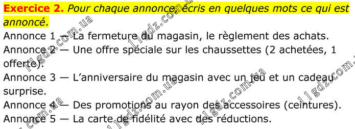 Exercice 2. Pour chaque annonce, écris en quelques mots ce qui est annoncé. Annonce 1 — La fermeture du magasin, le règlement des achats. Annonce 2 — Une offre spéciale sur les chaussettes (2 achetées, 1 offerte). Annonce 3 — L’anniversaire du magasin avec un jeu et un cadeau surprise. Annonce 4 — Des promotions au rayon des accessoires (ceintures). Annonce 5 — La carte de fidélité avec des réductions.