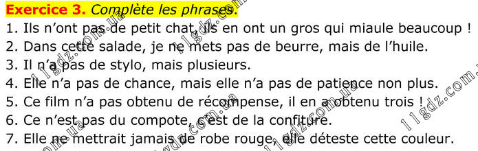 Exercice 3. Complète les phrases. 1. Ils n’ont pas de petit chat, ils en ont un gros qui miaule beaucoup ! 2. Dans cette salade, je ne mets pas de beurre, mais de l’huile. 3. Il n’a pas de stylo, mais plusieurs. 4. Elle n’a pas de chance, mais elle n’a pas de patience non plus. 5. Ce film n’a pas obtenu de récompense, il en a obtenu trois ! 6. Ce n’est pas du compote, c’est de la confiture. 7. Elle ne mettrait jamais de robe rouge, elle déteste cette couleur.
