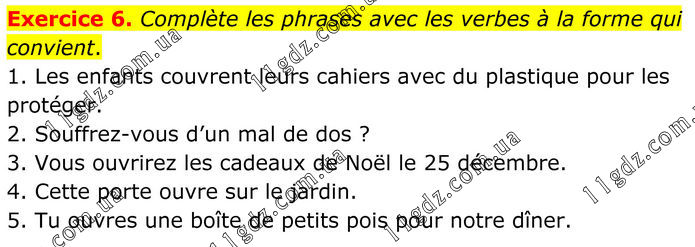 Exercice 6. Complète les phrases avec les verbes à la forme qui convient. 1. Les enfants couvrent leurs cahiers avec du plastique pour les protéger. 2. Souffrez-vous d’un mal de dos ? 3. Vous ouvrirez les cadeaux de Noël le 25 décembre. 4. Cette porte ouvre sur le jardin. 5. Tu ouvres une boîte de petits pois pour notre dîner.