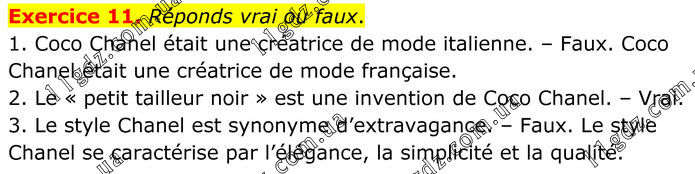 Exercice 11. Réponds vrai ou faux. 1. Coco Chanel était une créatrice de mode italienne. – Faux. Coco Chanel était une créatrice de mode française. 2. Le « petit tailleur noir » est une invention de Coco Chanel. – Vrai. 3. Le style Chanel est synonyme d’extravagance. – Faux. Le style Chanel se caractérise par l’élégance, la simplicité et la qualité.