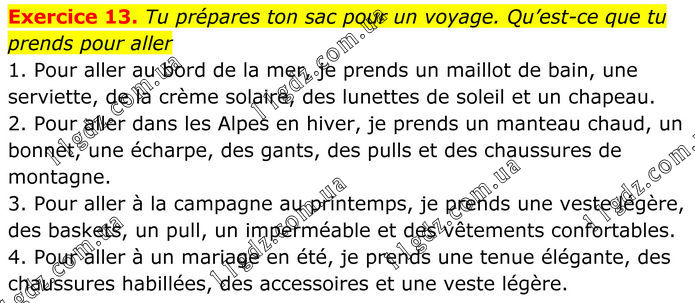 Exercice 13. Tu prépares ton sac pour un voyage. Qu’est-ce que tu prends pour aller 1. Pour aller au bord de la mer, je prends un maillot de bain, une serviette, de la crème solaire, des lunettes de soleil et un chapeau. 2. Pour aller dans les Alpes en hiver, je prends un manteau chaud, un bonnet, une écharpe, des gants, des pulls et des chaussures de montagne. 3. Pour aller à la campagne au printemps, je prends une veste légère, des baskets, un pull, un imperméable et des vêtements confortables. 4. Pour aller à un mariage en été, je prends une tenue élégante, des chaussures habillées, des accessoires et une veste légère.