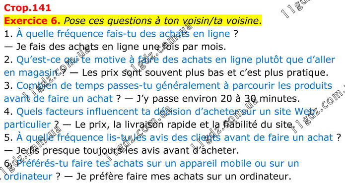 Exercice 6. Pose ces questions à ton voisin/ta voisine. 1. À quelle fréquence fais-tu des achats en ligne ? — Je fais des achats en ligne une fois par mois. 2. Qu’est-ce qui te motive à faire des achats en ligne plutôt que d’aller en magasin ? — Les prix sont souvent plus bas et c’est plus pratique. 3. Combien de temps passes-tu généralement à parcourir les produits avant de faire un achat ? — J’y passe environ 20 à 30 minutes. 4. Quels facteurs influencent ta décision d’acheter sur un site Web particulier ? — Le prix, la livraison rapide et la fiabilité du site. 5. À quelle fréquence lis-tu les avis des clients avant de faire un achat ? — Je lis presque toujours les avis avant d’acheter. 6. Préférés-tu faire tes achats sur un appareil mobile ou sur un ordinateur ? — Je préfère faire mes achats sur un ordinateur.
