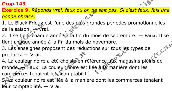 Exercice 9. Réponds vrai, faux ou on ne sait pas. Si c’est faux, fais une bonne phrase. 1. Le Black Friday est l’une des plus grandes périodes promotionnelles de la saison. — Vrai. 2. Il se tient chaque année à la fin du mois de septembre. — Faux. Il se tient chaque année à la fin du mois de novembre. 3. Les enseignes proposent des réductions sur tous les types de produits. — Vrai. 4. La couleur noire a été choisie en référence aux magasins pleins de monde. — Faux. La couleur noire est liée à la manière dont les commerces tenaient leur comptabilité. 5. La couleur noire est liée à la manière dont les commerces tenaient leur comptabilité. — Vrai.
