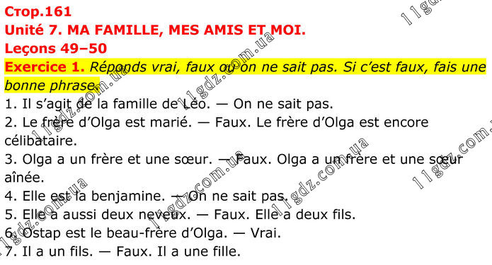 Unité 7. MA FAMILLE, MES AMIS ET MOI. Leçons 49–50 Exercice 1. Réponds vrai, faux ou on ne sait pas. Si c’est faux, fais une bonne phrase. 1. Il s’agit de la famille de Léo. — On ne sait pas. 2. Le frère d’Olga est marié. — Faux. Le frère d’Olga est encore célibataire. 3. Olga a un frère et une sœur. — Faux. Olga a un frère et une sœur aînée. 4. Elle est la benjamine. — On ne sait pas. 5. Elle a aussi deux neveux. — Faux. Elle a deux fils. 6. Ostap est le beau-frère d’Olga. — Vrai. 7. Il a un fils. — Faux. Il a une fille.