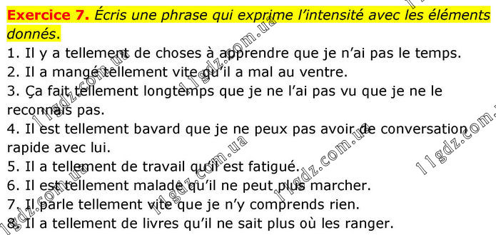Exercice 7. Écris une phrase qui exprime l’intensité avec les éléments donnés. 1. Il y a tellement de choses à apprendre que je n’ai pas le temps. 2. Il a mangé tellement vite qu’il a mal au ventre. 3. Ça fait tellement longtemps que je ne l’ai pas vu que je ne le reconnais pas. 4. Il est tellement bavard que je ne peux pas avoir de conversation rapide avec lui. 5. Il a tellement de travail qu’il est fatigué. 6. Il est tellement malade qu’il ne peut plus marcher. 7. Il parle tellement vite que je n’y comprends rien. 8. Il a tellement de livres qu’il ne sait plus où les ranger.