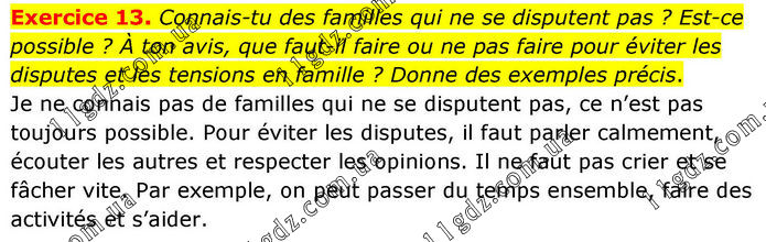 Exercice 13. Connais-tu des familles qui ne se disputent pas ? Est-ce possible ? À ton avis, que faut-il faire ou ne pas faire pour éviter les disputes et les tensions en famille ? Donne des exemples précis. Je ne connais pas de familles qui ne se disputent pas, ce n’est pas toujours possible. Pour éviter les disputes, il faut parler calmement, écouter les autres et respecter les opinions. Il ne faut pas crier et se fâcher vite. Par exemple, on peut passer du temps ensemble, faire des activités et s’aider.