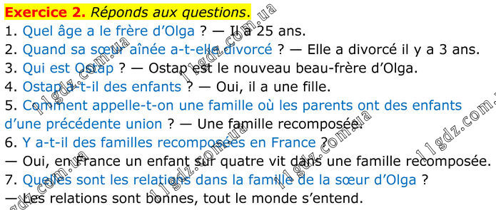 Exercice 2. Réponds aux questions. 1. Quel âge a le frère d’Olga ? — Il a 25 ans. 2. Quand sa sœur aînée a-t-elle divorcé ? — Elle a divorcé il y a 3 ans. 3. Qui est Ostap ? — Ostap est le nouveau beau-frère d’Olga. 4. Ostap a-t-il des enfants ? — Oui, il a une fille. 5. Comment appelle-t-on une famille où les parents ont des enfants d’une précédente union ? — Une famille recomposée. 6. Y a-t-il des familles recomposées en France ? — Oui, en France un enfant sur quatre vit dans une famille recomposée. 7. Quelles sont les relations dans la famille de la sœur d’Olga ? — Les relations sont bonnes, tout le monde s’entend.
