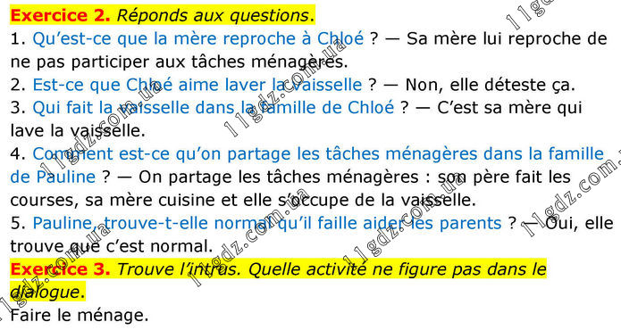 Exercice 2. Réponds aux questions. 1. Qu’est-ce que la mère reproche à Chloé ? — Sa mère lui reproche de ne pas participer aux tâches ménagères. 2. Est-ce que Chloé aime laver la vaisselle ? — Non, elle déteste ça. 3. Qui fait la vaisselle dans la famille de Chloé ? — C’est sa mère qui lave la vaisselle. 4. Comment est-ce qu’on partage les tâches ménagères dans la famille de Pauline ? — On partage les tâches ménagères : son père fait les courses, sa mère cuisine et elle s’occupe de la vaisselle. 5. Pauline, trouve-t-elle normal qu’il faille aider les parents ? — Oui, elle trouve que c’est normal. Exercice 3. Trouve l’intrus. Quelle activité ne figure pas dans le dialogue. Faire le ménage.