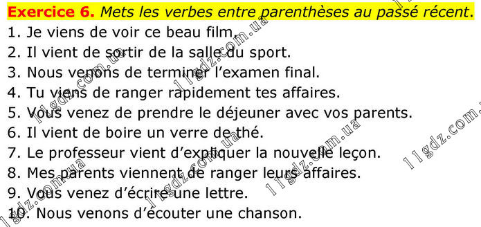 Exercice 6. Mets les verbes entre parenthèses au passé récent. 1. Je viens de voir ce beau film. 2. Il vient de sortir de la salle du sport. 3. Nous venons de terminer l’examen final. 4. Tu viens de ranger rapidement tes affaires. 5. Vous venez de prendre le déjeuner avec vos parents. 6. Il vient de boire un verre de thé. 7. Le professeur vient d’expliquer la nouvelle leçon. 8. Mes parents viennent de ranger leurs affaires. 9. Vous venez d’écrire une lettre. 10. Nous venons d’écouter une chanson.