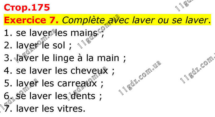 Exercice 7. Complète avec laver ou se laver. 1. se laver les mains ; 2. laver le sol ; 3. laver le linge à la main ; 4. se laver les cheveux ; 5. laver les carreaux ; 6. se laver les dents ; 7. laver les vitres.