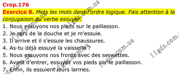 Exercice 8. Mets les mots dans l’ordre logique. Fais attention à la conjugaison du verbe essuyer. 1. Nous essuyons nos pieds sur le paillasson. 2. Je sors de la douche et je m’essuie. 3. Il arrive et il s’essuie les chaussures. 4. As-tu déjà essuyé la vaisselle ? 5. Nous essuyons nos fronts avec des serviettes. 6. Avant d’entrer, essuyez vos pieds sur le paillasson. 7. Enfin, ils essuient leurs larmes.