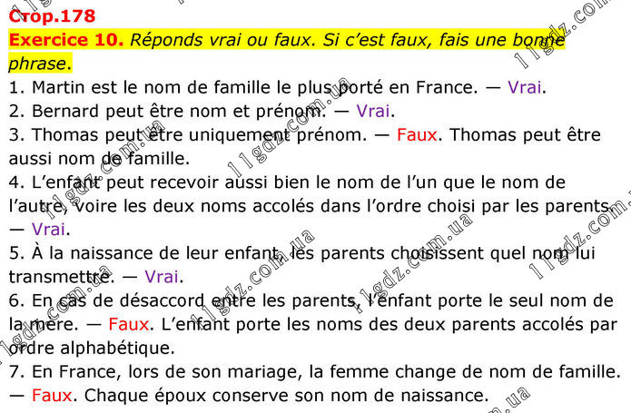 Exercice 10. Réponds vrai ou faux. Si c’est faux, fais une bonne phrase. 1. Martin est le nom de famille le plus porté en France. — Vrai. 2. Bernard peut être nom et prénom. — Vrai. 3. Thomas peut être uniquement prénom. — Faux. Thomas peut être aussi nom de famille. 4. L’enfant peut recevoir aussi bien le nom de l’un que le nom de l’autre, voire les deux noms accolés dans l’ordre choisi par les parents. — Vrai. 5. À la naissance de leur enfant, les parents choisissent quel nom lui transmettre. — Vrai. 6. En cas de désaccord entre les parents, l’enfant porte le seul nom de la mère. — Faux. L’enfant porte les noms des deux parents accolés par ordre alphabétique. 7. En France, lors de son mariage, la femme change de nom de famille. — Faux. Chaque époux conserve son nom de naissance.