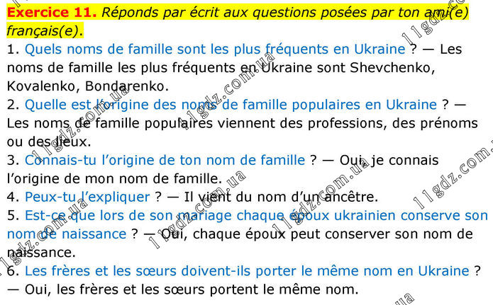 Exercice 11. Réponds par écrit aux questions posées par ton ami(e) français(e). 1. Quels noms de famille sont les plus fréquents en Ukraine ? — Les noms de famille les plus fréquents en Ukraine sont Shevchenko, Kovalenko, Bondarenko. 2. Quelle est l’origine des noms de famille populaires en Ukraine ? — Les noms de famille populaires viennent des professions, des prénoms ou des lieux. 3. Connais-tu l’origine de ton nom de famille ? — Oui, je connais l’origine de mon nom de famille. 4. Peux-tu l’expliquer ? — Il vient du nom d’un ancêtre. 5. Est-ce que lors de son mariage chaque époux ukrainien conserve son nom de naissance ? — Oui, chaque époux peut conserver son nom de naissance. 6. Les frères et les sœurs doivent-ils porter le même nom en Ukraine ? — Oui, les frères et les sœurs portent le même nom.