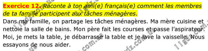 Exercice 12. Raconte à ton ami(e) français(e) comment les membres de ta famille participent aux tâches ménagères. Dans ma famille, on partage les tâches ménagères. Ma mère cuisine et nettoie la salle de bains. Mon père fait les courses et passe l’aspirateur. Moi, je mets la table, je débarrasse la table et je lave la vaisselle. Nous essayons de nous aider.