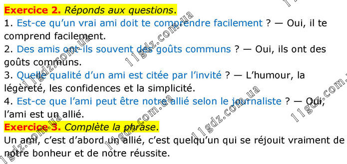 Exercice 2. Réponds aux questions. 1. Est-ce qu’un vrai ami doit te comprendre facilement ? — Oui, il te comprend facilement. 2. Des amis ont-ils souvent des goûts communs ? — Oui, ils ont des goûts communs. 3. Quelle qualité d’un ami est citée par l’invité ? — L’humour, la légèreté, les confidences et la simplicité. 4. Est-ce que l’ami peut être notre allié selon le journaliste ? — Oui, l’ami est un allié. Exercice 3. Complète la phrase. Un ami, c’est d’abord un allié, c’est quelqu’un qui se réjouit vraiment de notre bonheur et de notre réussite.