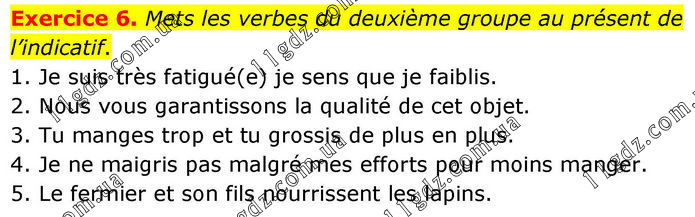 Exercice 6. Mets les verbes du deuxième groupe au présent de l’indicatif. 1. Je suis très fatigué(e) je sens que je faiblis. 2. Nous vous garantissons la qualité de cet objet. 3. Tu manges trop et tu grossis de plus en plus. 4. Je ne maigris pas malgré mes efforts pour moins manger. 5. Le fermier et son fils nourrissent les lapins.