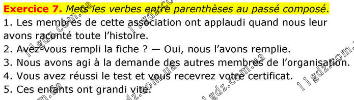 Exercice 7. Mets les verbes entre parenthèses au passé composé. 1. Les membres de cette association ont applaudi quand nous leur avons raconté toute l’histoire. 2. Avez-vous rempli la fiche ? — Oui, nous l’avons remplie. 3. Nous avons agi à la demande des autres membres de l’organisation. 4. Vous avez réussi le test et vous recevrez votre certificat. 5. Ces enfants ont grandi vite.