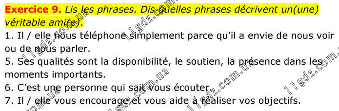 Exercice 9. Lis les phrases. Dis quelles phrases décrivent un(une) véritable ami(e). 1. Il / elle nous téléphone simplement parce qu’il a envie de nous voir ou de nous parler. 5. Ses qualités sont la disponibilité, le soutien, la présence dans les moments importants. 6. C’est une personne qui sait vous écouter. 7. Il / elle vous encourage et vous aide à réaliser vos objectifs.