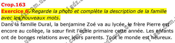 Exercice 6. Regarde la photo et complète la description de la famille avec les nouveaux mots. Dans la famille Dural, la benjamine Zoé va au lycée, le frère Pierre est encore au collège, la sœur finit l’école primaire cette année. Les enfants ont de bonnes relations avec leurs parents. Tout le monde est heureux.