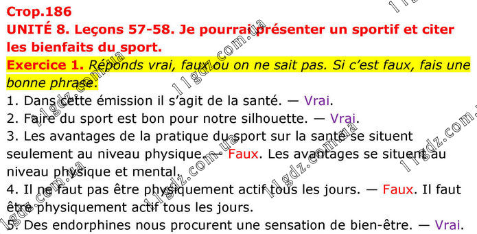 UNITÉ 8. Leçons 57-58. Je pourrai présenter un sportif et citer les bienfaits du sport. Exercice 1. Réponds vrai, faux ou on ne sait pas. Si c’est faux, fais une bonne phrase. 1. Dans cette émission il s’agit de la santé. — Vrai. 2. Faire du sport est bon pour notre silhouette. — Vrai. 3. Les avantages de la pratique du sport sur la santé se situent seulement au niveau physique. — Faux. Les avantages se situent au niveau physique et mental. 4. Il ne faut pas être physiquement actif tous les jours. — Faux. Il faut être physiquement actif tous les jours. 5. Des endorphines nous procurent une sensation de bien-être. — Vrai.