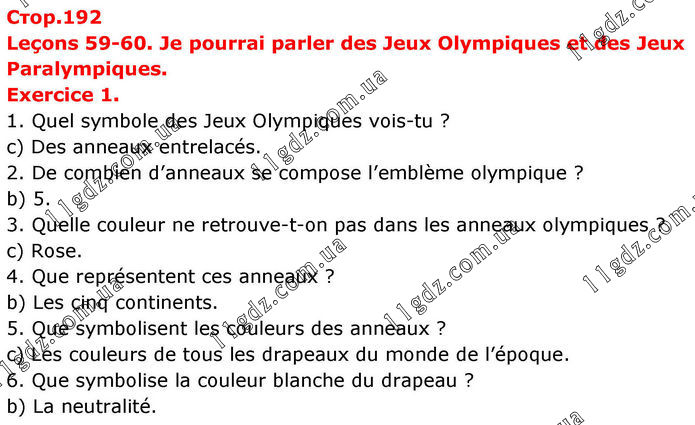 Leçons 59-60. Je pourrai parler des Jeux Olympiques et des Jeux Paralympiques. Exercice 1. 1. Quel symbole des Jeux Olympiques vois-tu ? c) Des anneaux entrelacés. 2. De combien d’anneaux se compose l’emblème olympique ? b) 5. 3. Quelle couleur ne retrouve-t-on pas dans les anneaux olympiques ? c) Rose. 4. Que représentent ces anneaux ? b) Les cinq continents. 5. Que symbolisent les couleurs des anneaux ? c) Les couleurs de tous les drapeaux du monde de l’époque. 6. Que symbolise la couleur blanche du drapeau ? b) La neutralité.