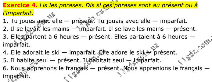 Exercice 4. Lis les phrases. Dis si ces phrases sont au présent ou à l’imparfait. 1. Tu joues avec elle — présent. Tu jouais avec elle — imparfait. 2. Il se lavait les mains — imparfait. Il se lave les mains — présent. 3. Elles partent à 6 heures — présent. Elles partaient à 6 heures — imparfait. 4. Elle adorait le ski — imparfait. Elle adore le ski — présent. 5. Il habite seul — présent. Il habitait seul — imparfait. 6. Nous apprenons le français — présent. Nous apprenions le français — imparfait.