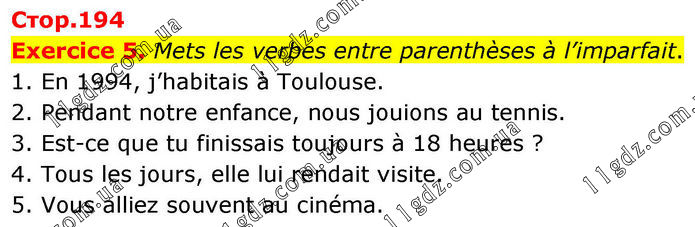 Exercice 5. Mets les verbes entre parenthèses à l’imparfait. 1. En 1994, j’habitais à Toulouse. 2. Pendant notre enfance, nous jouions au tennis. 3. Est-ce que tu finissais toujours à 18 heures ? 4. Tous les jours, elle lui rendait visite. 5. Vous alliez souvent au cinéma.