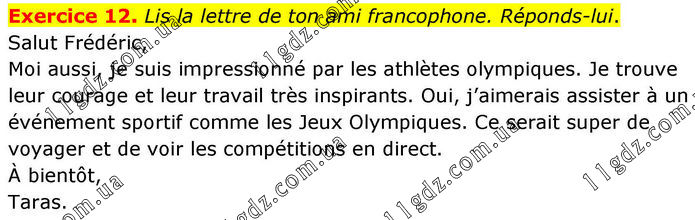 Exercice 12. Lis la lettre de ton ami francophone. Réponds-lui. Salut Frédéric, Moi aussi, je suis impressionné par les athlètes olympiques. Je trouve leur courage et leur travail très inspirants. Oui, j’aimerais assister à un événement sportif comme les Jeux Olympiques. Ce serait super de voyager et de voir les compétitions en direct. À bientôt, Taras.
