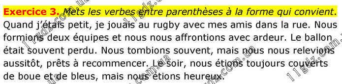 Exercice 3. Mets les verbes entre parenthèses à la forme qui convient. Quand j’étais petit, je jouais au rugby avec mes amis dans la rue. Nous formions deux équipes et nous nous affrontions avec ardeur. Le ballon était souvent perdu. Nous tombions souvent, mais nous nous relevions aussitôt, prêts à recommencer. Le soir, nous étions toujours couverts de boue et de bleus, mais nous étions heureux.