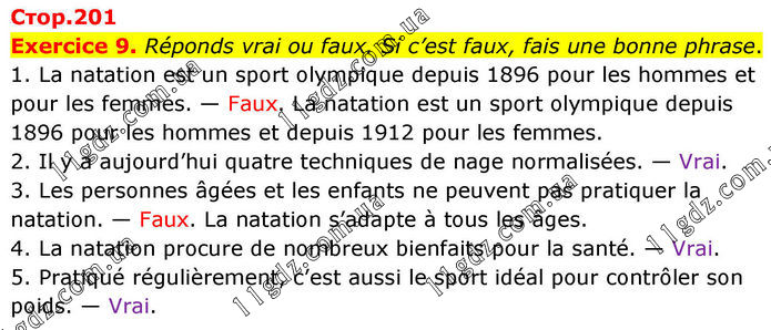 Exercice 9. Réponds vrai ou faux. Si c’est faux, fais une bonne phrase. 1. La natation est un sport olympique depuis 1896 pour les hommes et pour les femmes. — Faux. La natation est un sport olympique depuis 1896 pour les hommes et depuis 1912 pour les femmes. 2. Il y a aujourd’hui quatre techniques de nage normalisées. — Vrai. 3. Les personnes âgées et les enfants ne peuvent pas pratiquer la natation. — Faux. La natation s’adapte à tous les âges. 4. La natation procure de nombreux bienfaits pour la santé. — Vrai. 5. Pratiqué régulièrement, c’est aussi le sport idéal pour contrôler son poids. — Vrai.
