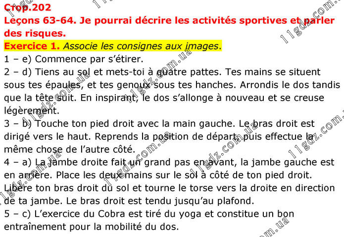 Leçons 63-64. Je pourrai décrire les activités sportives et parler des risques. Exercice 1. Associe les consignes aux images. 1 – e) Commence par s’étirer. 2 – d) Tiens au sol et mets-toi à quatre pattes. Tes mains se situent sous tes épaules, et tes genoux sous tes hanches. Arrondis le dos tandis que la tête suit. En inspirant, le dos s’allonge à nouveau et se creuse légèrement. 3 – b) Touche ton pied droit avec la main gauche. Le bras droit est dirigé vers le haut. Reprends la position de départ, puis effectue la même chose de l’autre côté. 4 – a) La jambe droite fait un grand pas en avant, la jambe gauche est en arrière. Place les deux mains sur le sol à côté de ton pied droit. Libère ton bras droit du sol et tourne le torse vers la droite en direction de ta jambe. Le bras droit est tendu jusqu’au plafond. 5 – c) L’exercice du Cobra est tiré du yoga et constitue un bon entraînement pour la mobilité du dos.