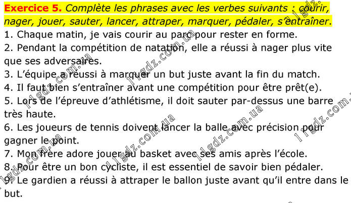Exercice 5. Complète les phrases avec les verbes suivants : courir, nager, jouer, sauter, lancer, attraper, marquer, pédaler, s’entraîner. 1. Chaque matin, je vais courir au parc pour rester en forme. 2. Pendant la compétition de natation, elle a réussi à nager plus vite que ses adversaires. 3. L’équipe a réussi à marquer un but juste avant la fin du match. 4. Il faut bien s’entraîner avant une compétition pour être prêt(e). 5. Lors de l’épreuve d’athlétisme, il doit sauter par-dessus une barre très haute. 6. Les joueurs de tennis doivent lancer la balle avec précision pour gagner le point. 7. Mon frère adore jouer au basket avec ses amis après l’école. 8. Pour être un bon cycliste, il est essentiel de savoir bien pédaler. 9. Le gardien a réussi à attraper le ballon juste avant qu’il entre dans le but.