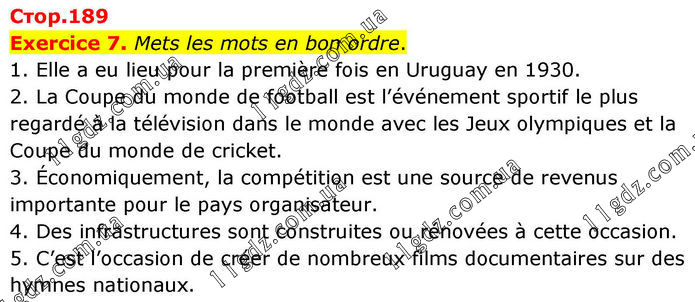 Exercice 7. Mets les mots en bon ordre. 1. Elle a eu lieu pour la première fois en Uruguay en 1930. 2. La Coupe du monde de football est l’événement sportif le plus regardé à la télévision dans le monde avec les Jeux olympiques et la Coupe du monde de cricket. 3. Économiquement, la compétition est une source de revenus importante pour le pays organisateur. 4. Des infrastructures sont construites ou rénovées à cette occasion. 5. C’est l’occasion de créer de nombreux films documentaires sur des hymnes nationaux.