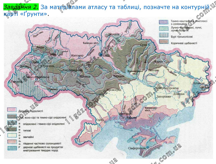 За матеріалами атласу та таблиці, позначте на контурній карті «Ґрунти».