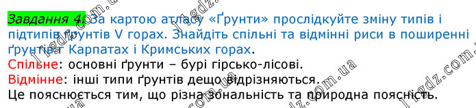 За картою атласу «Ґрунти» прослідкуйте зміну типів і підтипів ґрунтів V горах. Знайдіть спільні та відмінні риси в поширенні ґрунтів г Карпатах і Кримських горах.