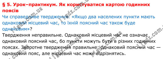 § 5. Урок–практикум. Як користуватися картою годинних поясів Чи справедливе твердження: «Якщо два населених пункти мають однаковий місцевий час, то їхній поясний час також буде однаковим»? Твердження неправильне. Однаковий місцевий час не означає однаковий поясний час, бо пункти можуть бути в різних годинних поясах. Зворотне твердження правильне: однаковий поясний час — однаковий пояс, але місцевий час може відрізнятись.