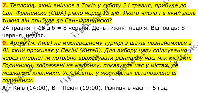 7. Теплохід, який вийшов з Токіо у суботу 24 травня, прибуде до Сан–Франциско (США) рівно через 15 діб. Якого числа і в який день тижня він прибуде до Сан–Франциско? 24 травня + 15 діб = 8 червня. День тижня: неділя. Відповідь: 8 червня, неділя. 9. Артур (м. Київ) на міжнародному турнірі з шахів познайомився з Лі, який проживає у Пекіні (Китай). Для вибору часу спілкування через інтернет їм потрібно враховувати різницю у часі між містами. Годинники, зображені на малюнку, показують час у містах, де мешкають хлопчики. Установіть, у яких містах встановлено ці годинники. A – Київ (14:00), B – Пекін (19:00). Різниця в часі — 5 год.