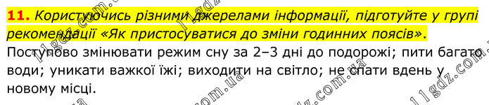 11. Користуючись різними джерелами інформації, підготуйте у групі рекомендації «Як пристосуватися до зміни годинних поясів». Поступово змінювати режим сну за 2–3 дні до подорожі; пити багато води; уникати важкої їжі; виходити на світло; не спати вдень у новому місці.