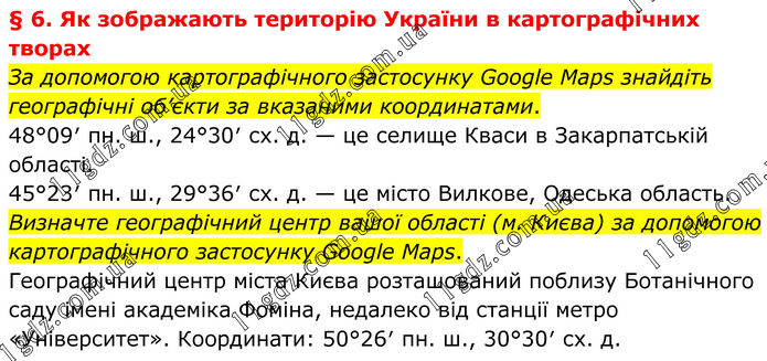 § 6. Як зображають територію України в картографічних творах За допомогою картографічного застосунку Google Maps знайдіть географічні об’єкти за вказаними координатами. 48°09′ пн. ш., 24°30′ сх. д. — це селище Кваси в Закарпатській області. 45°23′ пн. ш., 29°36′ сх. д. — це місто Вилкове, Одеська область. Визначте географічний центр вашої області (м. Києва) за допомогою картографічного застосунку Google Maps. Географічний центр міста Києва розташований поблизу Ботанічного саду імені академіка Фоміна, недалеко від станції метро «Університет». Координати: 50°26′ пн. ш., 30°30′ сх. д.