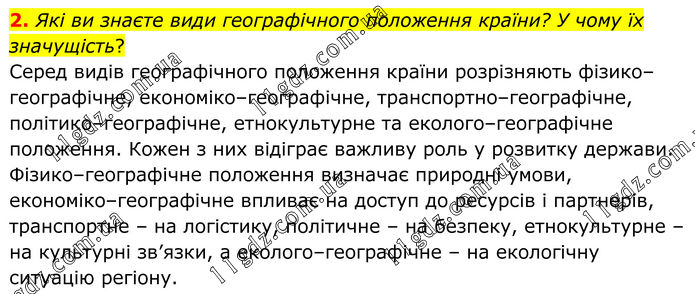Які ви знаєте види географічного положення країни? У чому їх значущість? Серед видів географічного положення країни розрізняють фізико–географічне, економіко–географічне, транспортно–географічне, політико–географічне, етнокультурне та еколого–географічне положення. Кожен з них відіграє важливу роль у розвитку держави. Фізико–географічне положення визначає природні умови, економіко–географічне впливає на доступ до ресурсів і партнерів, транспортне – на логістику, політичне – на безпеку, етнокультурне – на культурні зв’язки, а еколого–географічне – на екологічну ситуацію регіону.