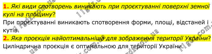 1. Які види спотворень виникають при проєктуванні поверхні земної кулі на площину? При проєктуванні виникають спотворення форми, площі, відстаней і кутів. 2. Яка проєкція найоптимальніша для зображення території України? Циліндрична проєкція є оптимальною для території України.