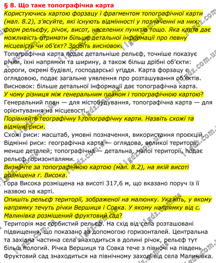 § 8. Що таке топографічна карта Користуючись картою форзацу і фрагментом топографічної карти (мал. 8.2), з’ясуйте, які існують відмінності у позначенні на них: форм рельєфу, річок, висот, населених пунктів тощо. Яка карта дає можливість отримати більше детальної інформації про певну місцевість чи об’єкт? Зробіть висновок. Топографічна карта подає детальніше рельєф, точніше показує річки, їхні напрямки та ширину, а також більш дрібні об’єкти: дороги, окремі будівлі, господарські угіддя. Карта форзацу є оглядовою, подає загальне уявлення про розташування об’єктів. Висновок: більше детальної інформації дає топографічна карта. У чому різниця між генеральним планом і топографічною картою? Генеральний план — для містобудування, топографічна карта — для орієнтування на місцевості. Порівняйте географічну і топографічну карти. Назвіть схожі та відмінні риси. Схожі риси: масштаб, умовні позначення, використання проєкцій. Відмінні риси: географічна карта — оглядова, великої території, менше деталей; топографічна — детальна, малої території, подає рельєф горизонталями. Визначте за топографічною картою (мал. 8.2), на якій висоті розміщена г. Висока. Гора Висока розміщена на висоті 317,6 м, що вказано поруч із її назвою на карті. Опишіть рельєф території, зображеної на малюнку. Укажіть, у якому напрямку течуть річки Вершиця і Совка. У якому напрямку від с. Малинівка розміщений фруктовий сад? Територія має горбистий рельєф. На схід від села розташовані підвищення, що показано за допомогою горизонталей. Центральна та західна частина села знаходиться в долині річок, рельєф тут більш пологий. Річка Вершиця та Совка тече з півночі на південь. Фруктовий сад знаходиться на північному заході від села Малинівка.