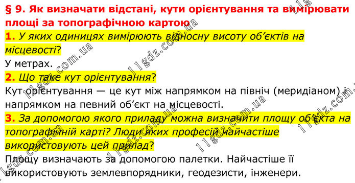 § 9. Як визначати відстані, кути орієнтування та вимірювати площі за топографічною картою 1. У яких одиницях вимірюють відносну висоту об’єктів на місцевості? У метрах. 2. Що таке кут орієнтування? Кут орієнтування — це кут між напрямком на північ (меридіаном) і напрямком на певний об’єкт на місцевості. 3. За допомогою якого приладу можна визначити площу об’єкта на топографічній карті? Люди яких професій найчастіше використовують цей прилад? Площу визначають за допомогою палетки. Найчастіше її використовують землевпорядники, геодезисти, інженери.
