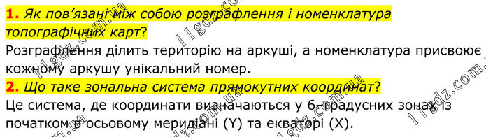 1. Як пов’язані між собою розграфлення і номенклатура топографічних карт? Розграфлення ділить територію на аркуші, а номенклатура присвоює кожному аркушу унікальний номер. 2. Що таке зональна система прямокутних координат? Це система, де координати визначаються у 6–градусних зонах із початком в осьовому меридіані (Y) та екваторі (X).