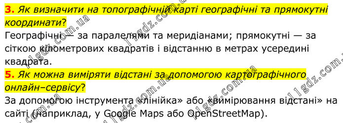 3. Як визначити на топографічній карті географічні та прямокутні координати? Географічні — за паралелями та меридіанами; прямокутні — за сіткою кілометрових квадратів і відстанню в метрах усередині квадрата. 5. Як можна виміряти відстані за допомогою картографічного онлайн–сервісу? За допомогою інструмента «лінійка» або «вимірювання відстані» на сайті (наприклад, у Google Maps або OpenStreetMap).