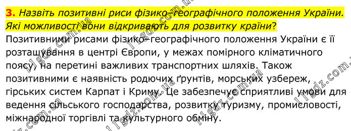 Назвіть позитивні риси фізико–географічного положення України. Які можливості вони відкривають для розвитку країни? Позитивними рисами фізико–географічного положення України є її розташування в центрі Європи, у межах помірного кліматичного поясу, на перетині важливих транспортних шляхів. Також позитивними є наявність родючих ґрунтів, морських узбереж, гірських систем Карпат і Криму. Це забезпечує сприятливі умови для ведення сільського господарства, розвитку туризму, промисловості, міжнародної торгівлі та культурного обміну.