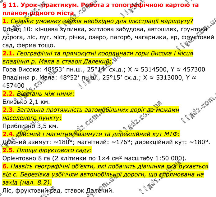 § 11. Урок–практикум. Робота з топографічною картою та планом рідного міста 1. Скільки умовних знаків необхідно для ілюстрації маршруту? Понад 10: кінцева зупинка, житлова забудова, автошлях, ґрунтова дорога, ліс, луг, міст, річка, озеро, пагорб, чагарники, яр, фруктовий сад, ферма тощо. 2.1. Географічні та прямокутні координати гори Висока і місця впадіння р. Мала в ставок Далекий: Гора Висока: 48°53′ пн.ш., 25°14′ сх.д.; X ≈ 5314500, Y ≈ 457300 Впадіння р. Мала: 48°52′ пн.ш., 25°15′ сх.д.; X ≈ 5313000, Y ≈ 457400 2.2. Відстань між ними: Близько 2,1 км. 2.3. Загальна протяжність автомобільних доріг за межами населеного пункту: Приблизно 3,5 км. 2.4. Дійсний і магнітний азимути та дирекційний кут МТФ: Дійсний азимут: ~180°; магнітний: ~176°; дирекційний кут: ~180°. 2.5. Площа фруктового саду: Орієнтовно 8 га (2 клітинки по 1×4 см² масштабу 1:50 000). 6. Назвіть географічні об’єкти, які побачить дівчинка яка рухається від с. Березівка узбіччям автомобільної дороги, що спрямована на захід (мал. 8.2). Ліс, фруктовий сад, ставок Далекий.